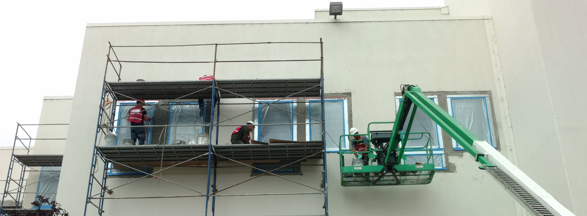 ARC’s EIFS work often consists of removing damaged panels to replace as necessary at wall areas. Subsurface and wall panel edges are ground down, and a waterproof membrane applied below cement panels to waterproof the wall. Walls are water tested to ensure a tight seal and custom foam fabricated around inside corners and recessed areas around each window. Dryvit (a type of synthetic stucco that is applied as a final coat to keep water from penetrating the other layers of the wall) is installed around the window openings. The repair areas are then primed and painted to match the existing walls.