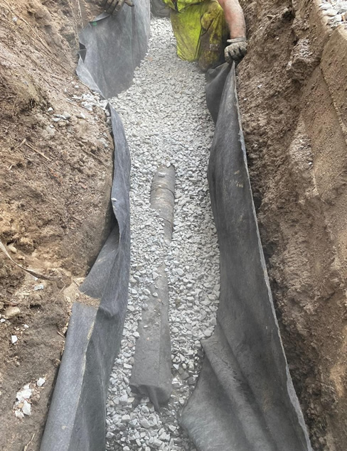 A French drain (also called a weeping tile, drain tile, perimeter drain or sub-surface drain) like the trench type shown in the above photo, is a common basement waterproofing and drainage solution. It’s a trench containing a perforated pipe that redirects surface water and groundwater away from the foundation. A French drain is a popular basement waterproofing solution that involves laying either perforated pipe or flexible corrugated pipe in a shallow trench along with gravel. The perforated pipe channels any excess water in the soil under and around your home’s foundation into a collection pit. From there, it’s channeled away from the foundation via gravity or by using a sump pump. A French drain system is most often installed outside a structure (residential or commercial building), buried in the soil along the foundation footing.