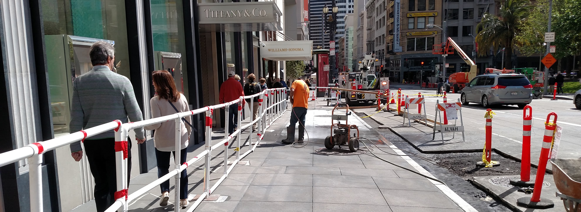 The photo above shows the last stages of cleaning a completely replaced sidewalk fronting the Tiffany & Co. store in San Francisco. Leakage from the sidewalk into a storage and electrical facility basement required replacing the entire failing membrane and sidewalk. In order to allow for foot traffic in and out of Tiffany’s, the project was divided into two lengthwise segments with 3 bridges to accommodate entries to and exits from the building.