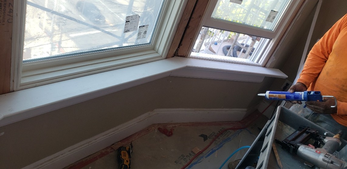 In the photo above, 18 existing failed window units have been removed and replaced by 18 custom retrofit windows. The windows are fit securely into the existing window openings, then urethane rubber sealant is applied to fully seal them from leakage. New interior and exterior trim is installed as necessary, primed, then painted.